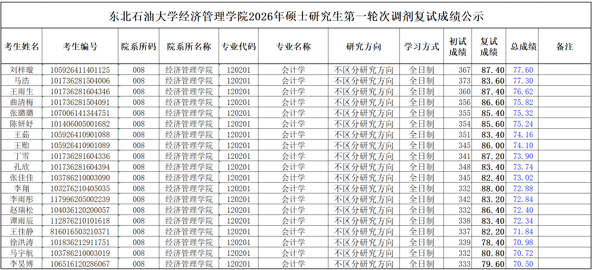 北石油大学英国上市公司3652026年硕士研究生第一轮次调剂复试成绩公示